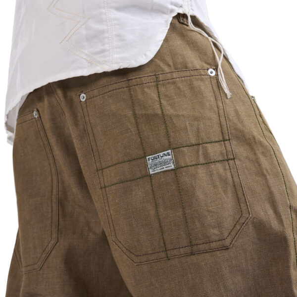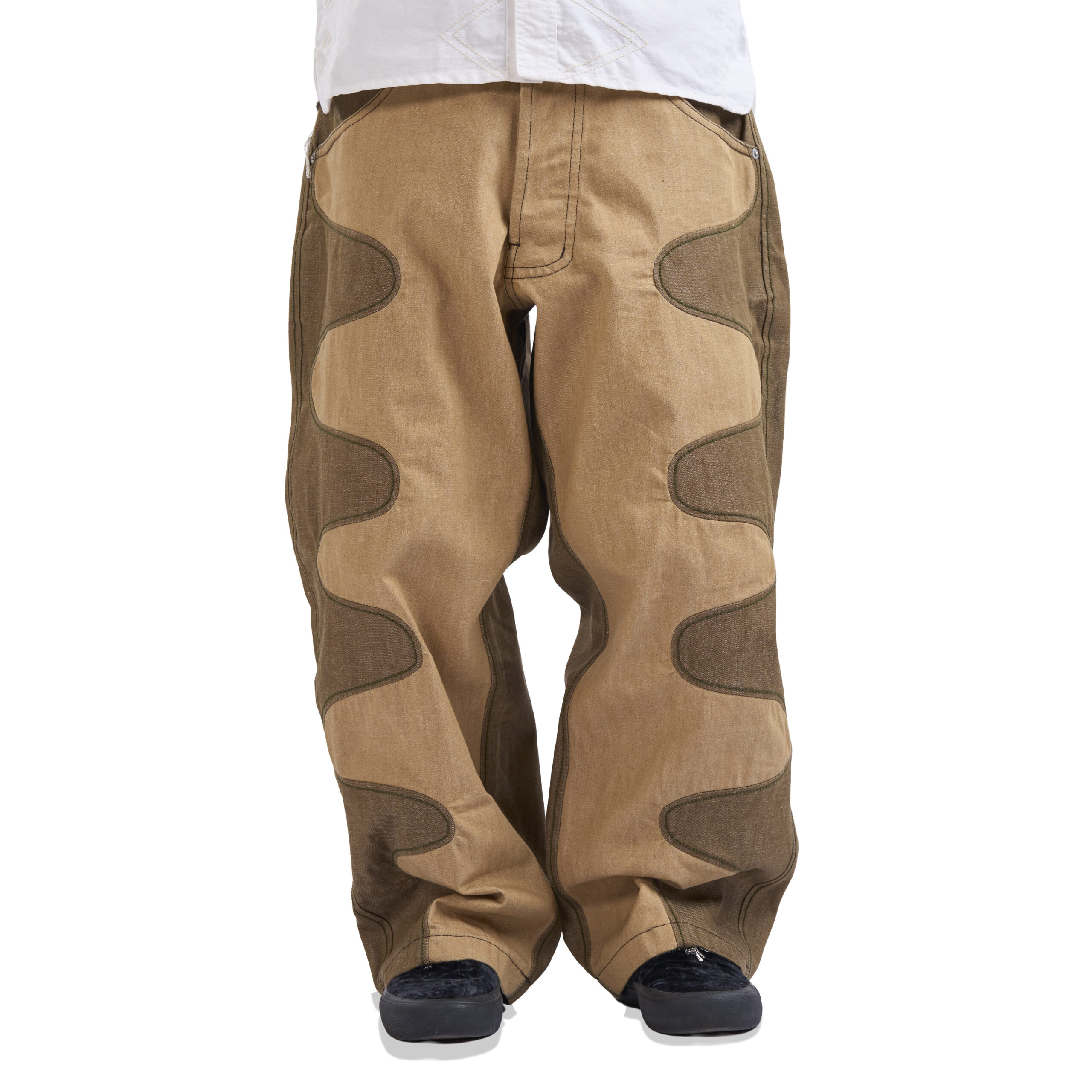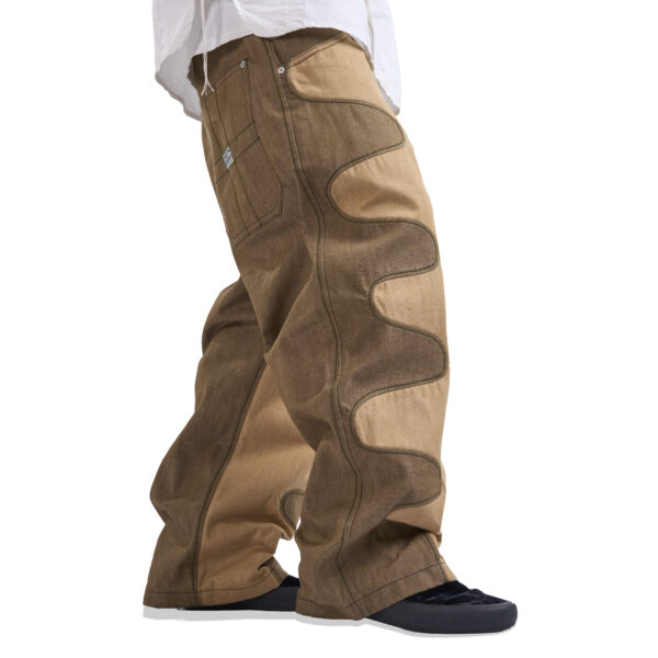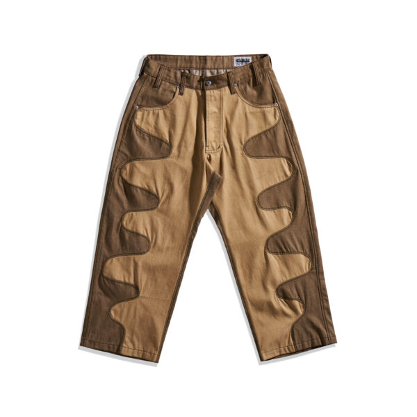 Four-pocket jean in 100% cotton denim from Collect Mills. Alpha Wave pattern-panel construction highlights the textures of the Dark Brown and Caramel textile. Signature Rope Stitch detailing in contrast color across seams and on right back pocket motif: a plus-sign around custom label tab. Belt loops are sewn with two-point construction and bartack reinforcement. Rivets on pockets and shank buttons on fly. Custom Fortune WWD-branded YKK hardware.