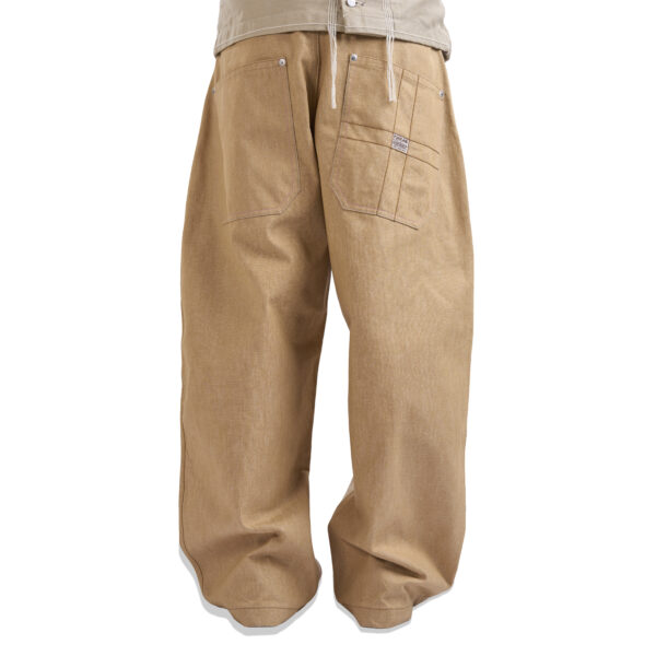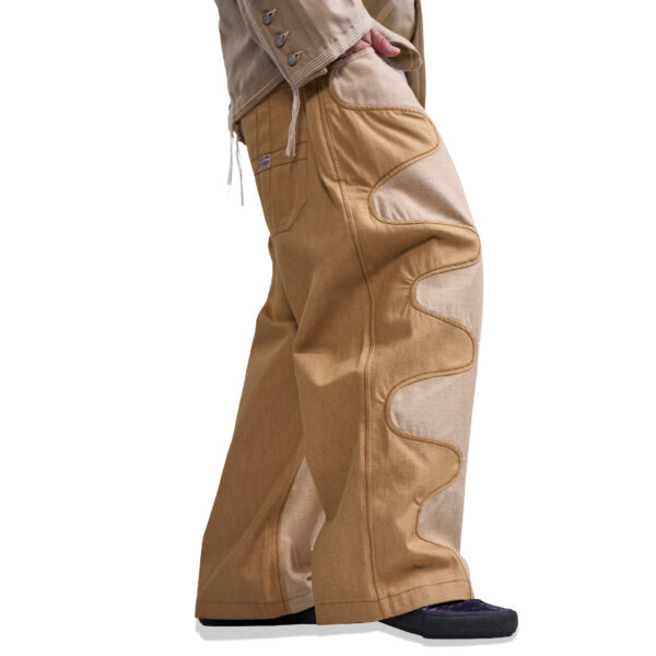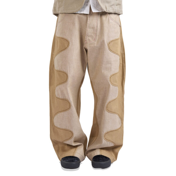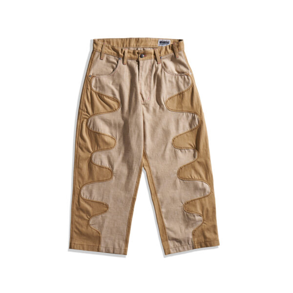 Four-pocket jean in 100% cotton denim from Collect Mills. Alpha Wave pattern-panel construction highlights the textures of the Cream and Caramel textile. Signature Rope Stitch detailing in contrast color across seams and on right back pocket motif: a plus-sign around custom label tab. Belt loops are sewn with two-point construction and bartack reinforcement. Rivets on pockets and shank buttons on fly. Custom Fortune WWD-branded YKK hardware.