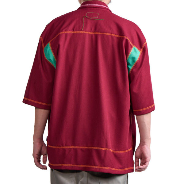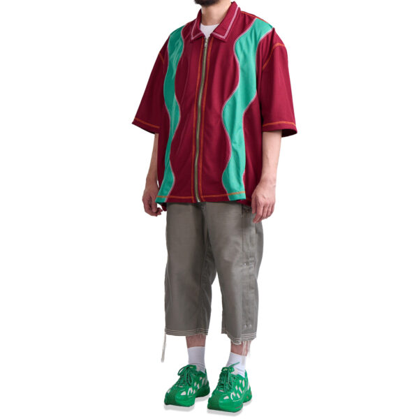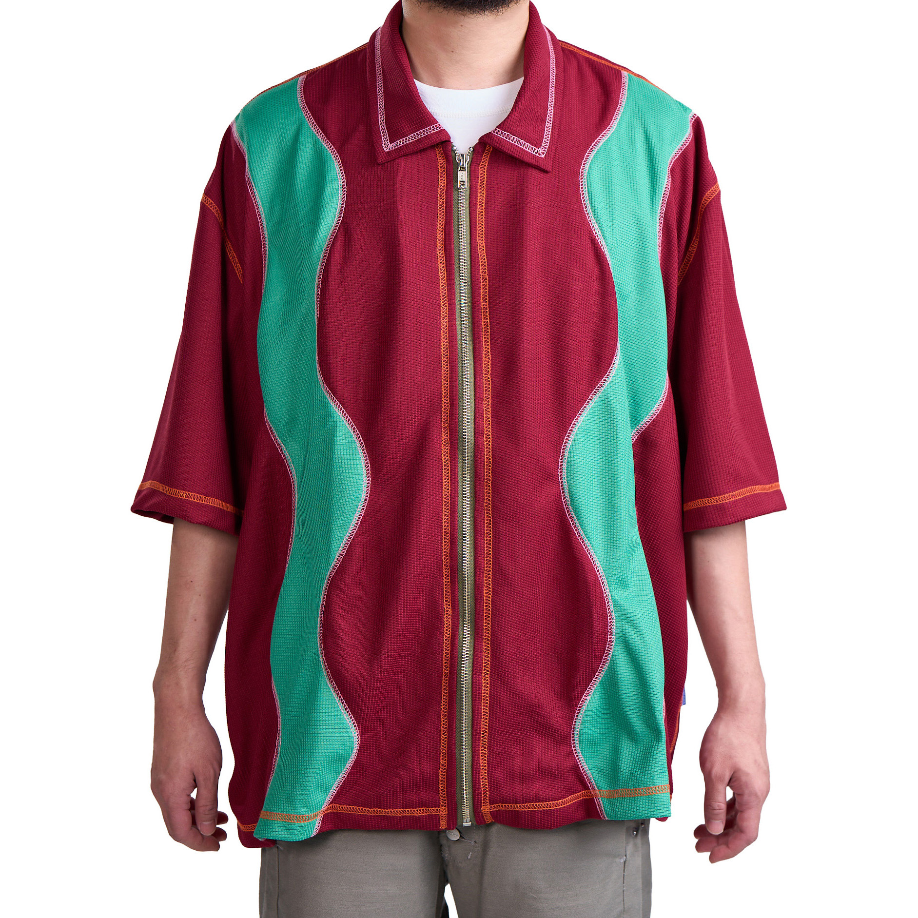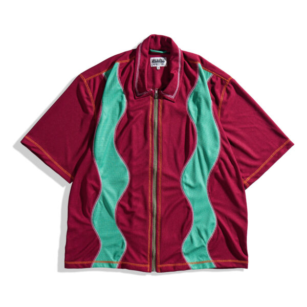 Polyester honeycomb textile bowling shirt with YKK zip-front closure. Maroon and Teal textile layout applied to Alpha Wave garment pattern. Two-tone contrast overlock stitching on seams.