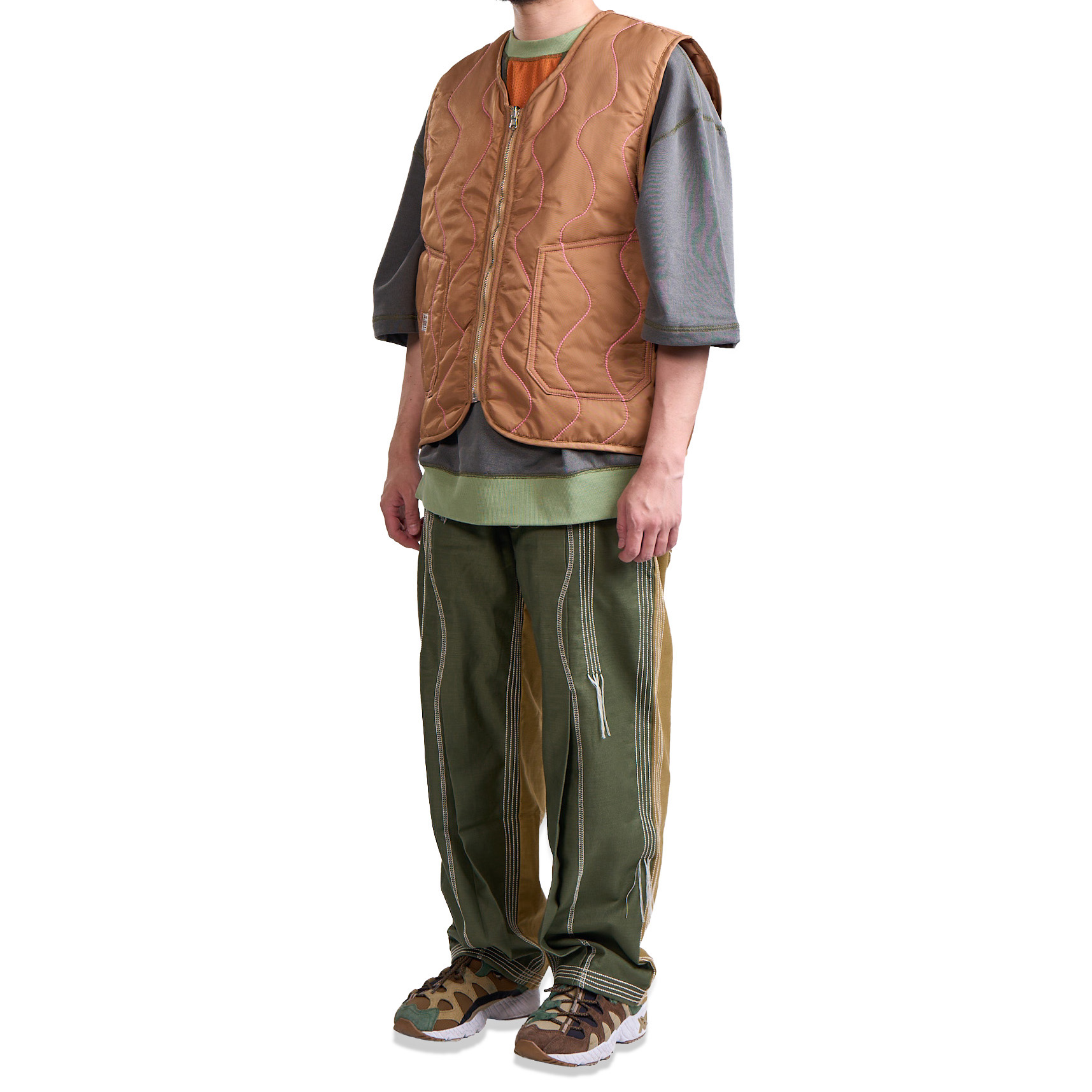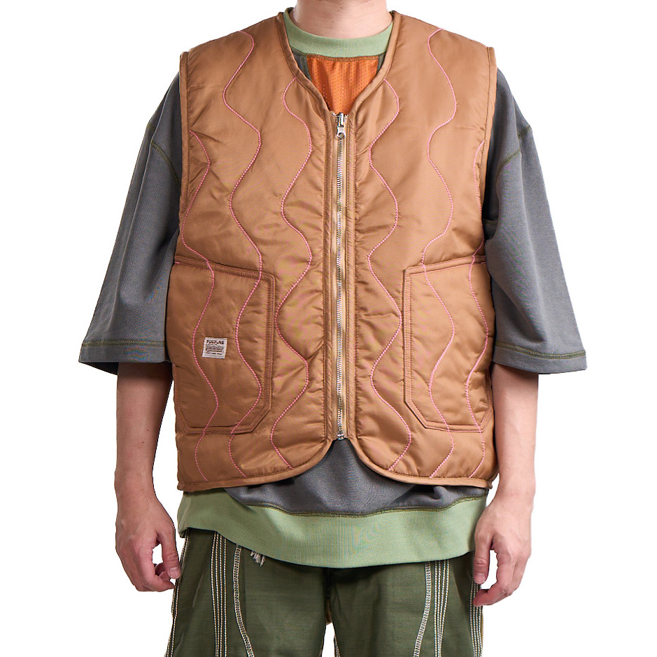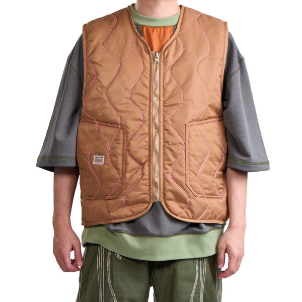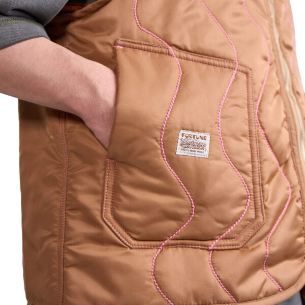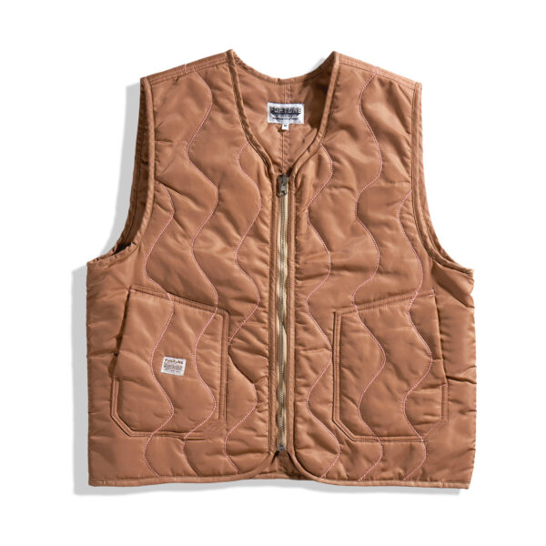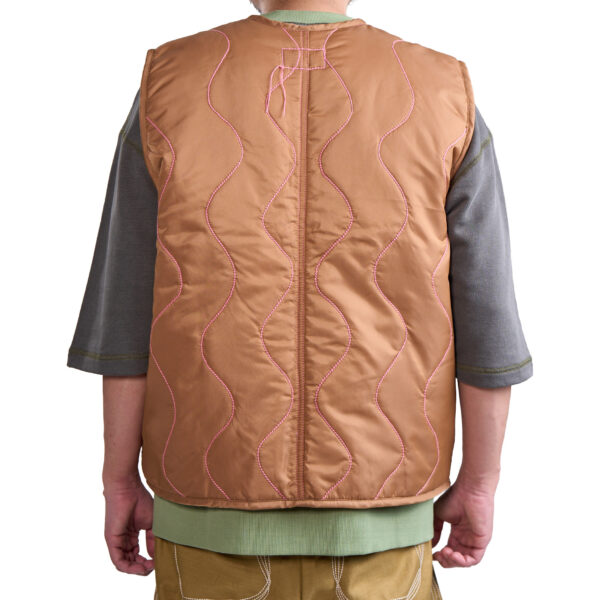 Quilted liner vest with lightweight insulation in Caramel nylon. Signature Rope Stitch detailing applied in Alpha Wave quilt pattern. Contrast stitching on seams. Reversible YKK zip lets you wear the plain side out for additional layering options. Finished with angled side entry patch pockets and a softly rounded hem.
