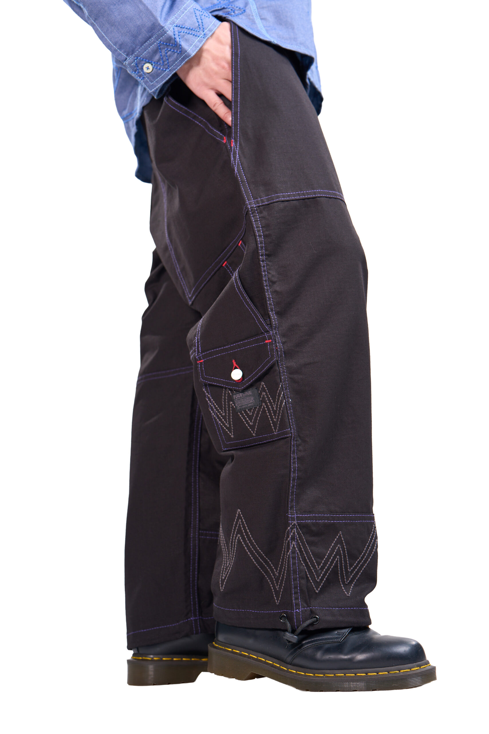 BETA BrainWave Ripstop Patch-Panel Carpenter Pants in patched cotton ripstop with contrast Signature Rope Stitch detailing and Beta Wave embroidery. Added storage via a front patch pocket with button flap. Slightly shorter inseam than previous versions, with new stoppered drawcord hems for silhouette tweaks. Made of 100% cotton ripstop.