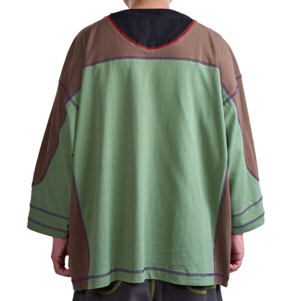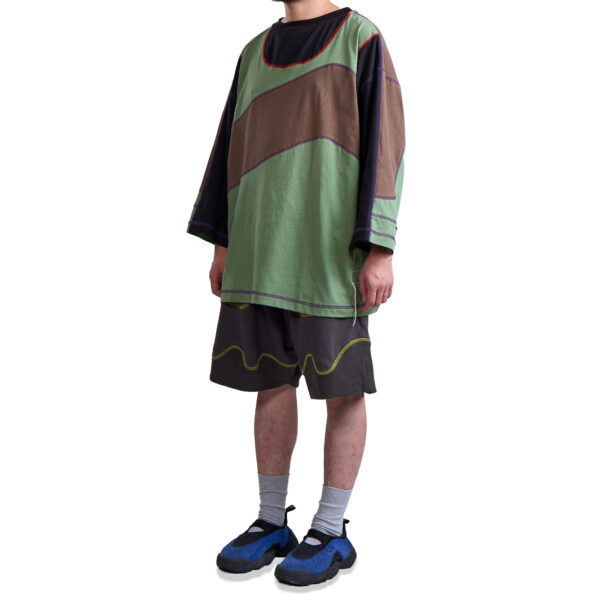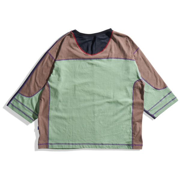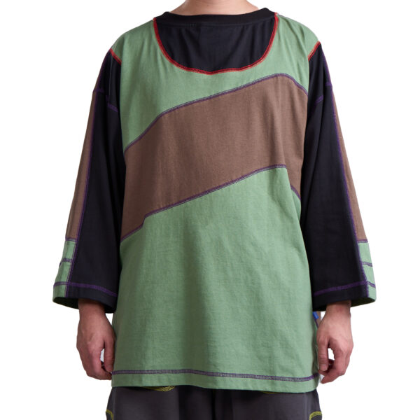 Signature No Front No Back (NFNB) short-sleeve tee in 100% cotton jersey. Delta Wave pattern with Sage, Black, and Brown color blocking on panels, finished with contrast overlock stitching. NFNB pattern can be worn with either panel in front.
