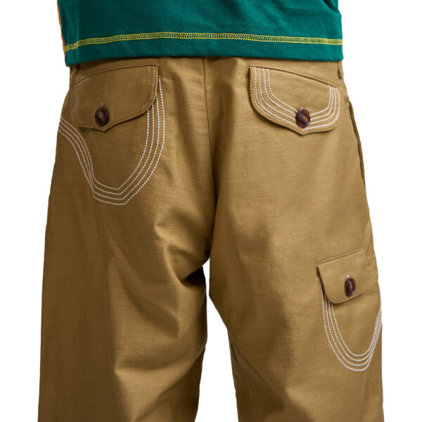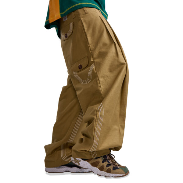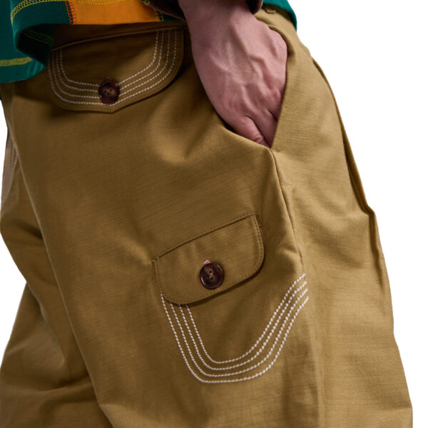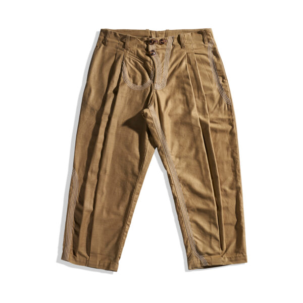 Version 3 of our Nut Works trouser in Caramel cotton back satin. 3-button asymmetrical flap fly closure, no zip. Sewn buttons, contrast stitching, side-seam pockets, three back pockets with stowable button flap closures: two on seat, one on leg. Additional open welted ticket pocket next to fly. Double pleated waist with single pleats mirrored on the hem. Finished with our Signature Rope Stitch detailing in Delta Wave pattern.
