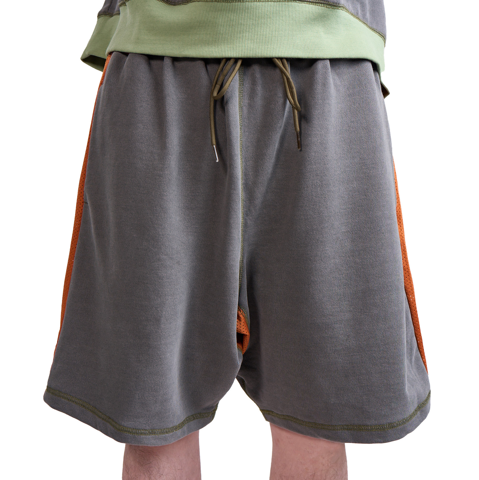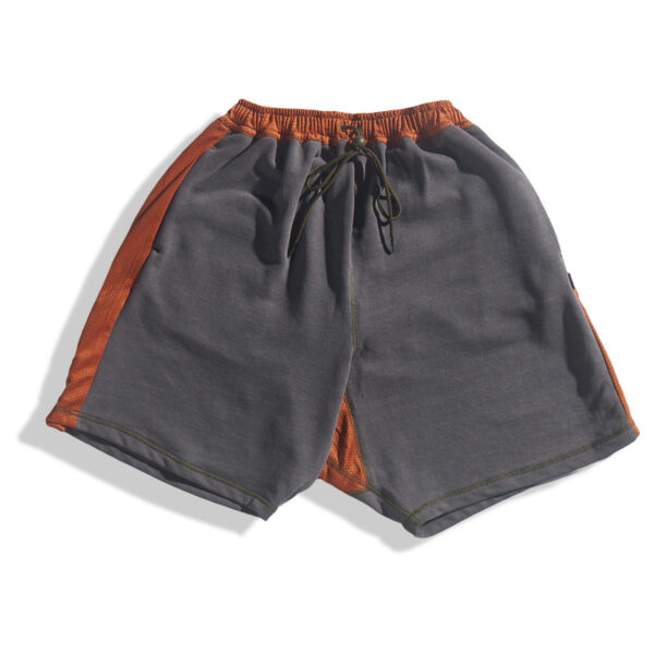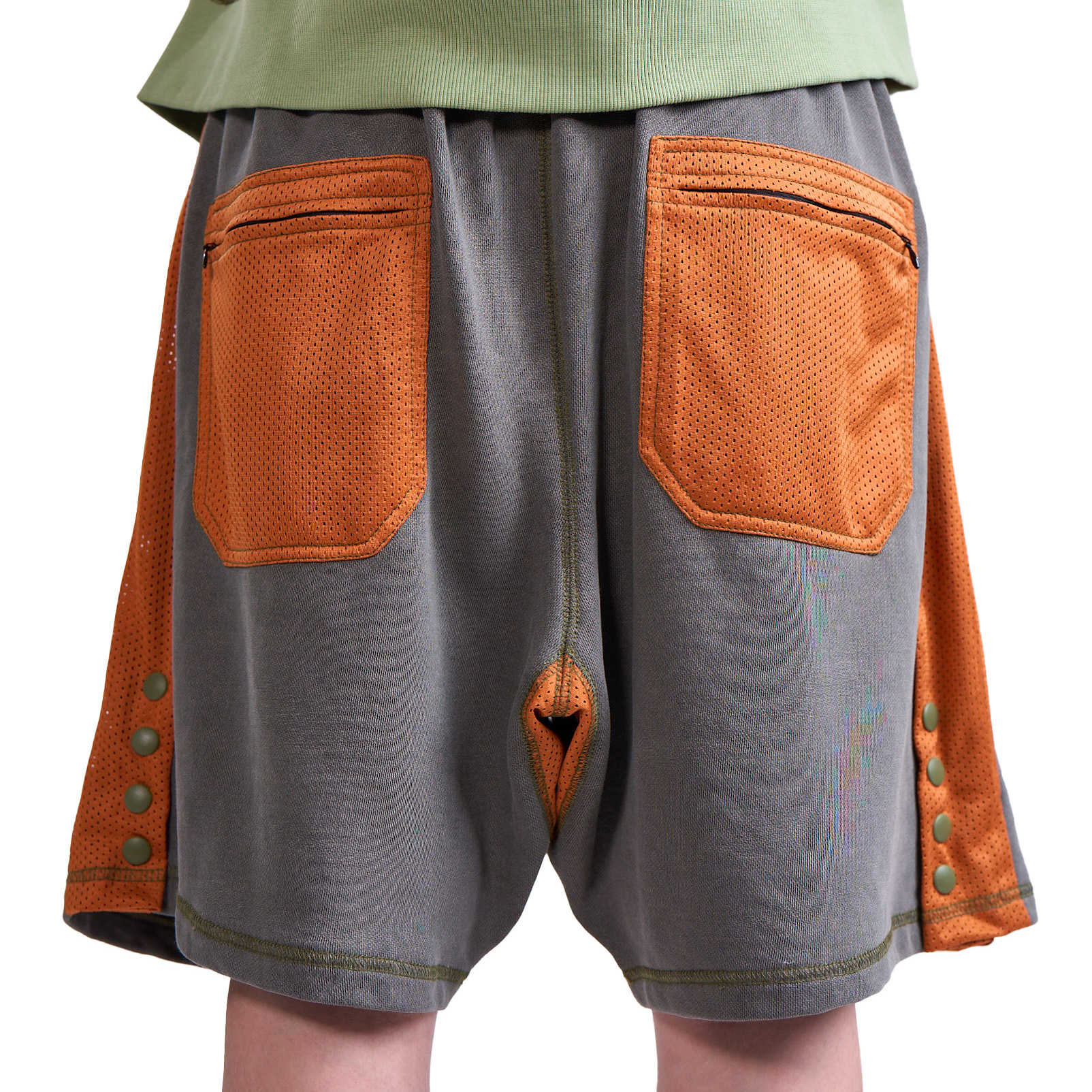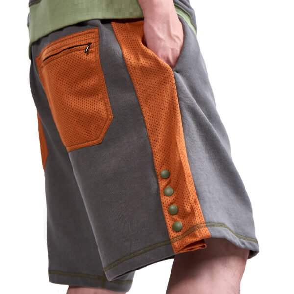 Relaxed-fit cotton terry shorts in Grey with contrast-color mesh at waistband, side stripes, on back patch pockets with YKK CONCEAL® zip closures, and crotch gusset. Drawstring waist with slide adjuster for comfortable, easy wear. Extended rise and side seam hand pockets. YKK Advancen snaps on side stripe vents to adjust volume. Finished with contrast stitching.