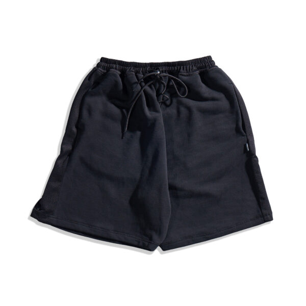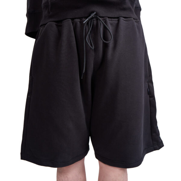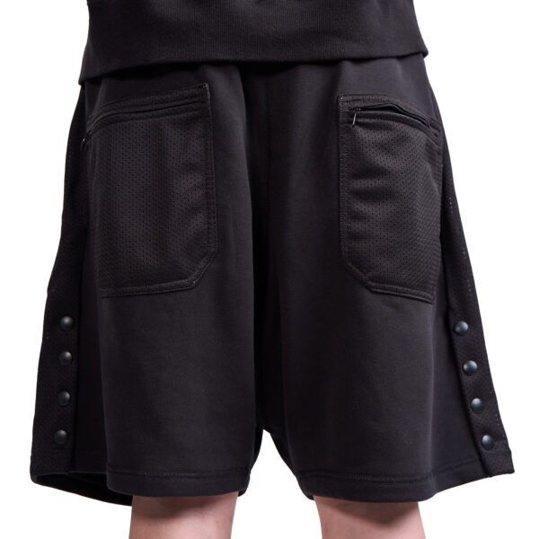 Relaxed-fit cotton terry shorts in Black with contrast-color mesh at waistband, side stripes, on back patch pockets with YKK CONCEAL® zip closures, and crotch gusset. Drawstring waist with slide adjuster for comfortable, easy wear. Extended rise and side seam hand pockets. YKK Advancen snaps on side stripe vents to adjust volume. Finished with contrast stitching.