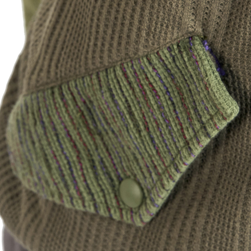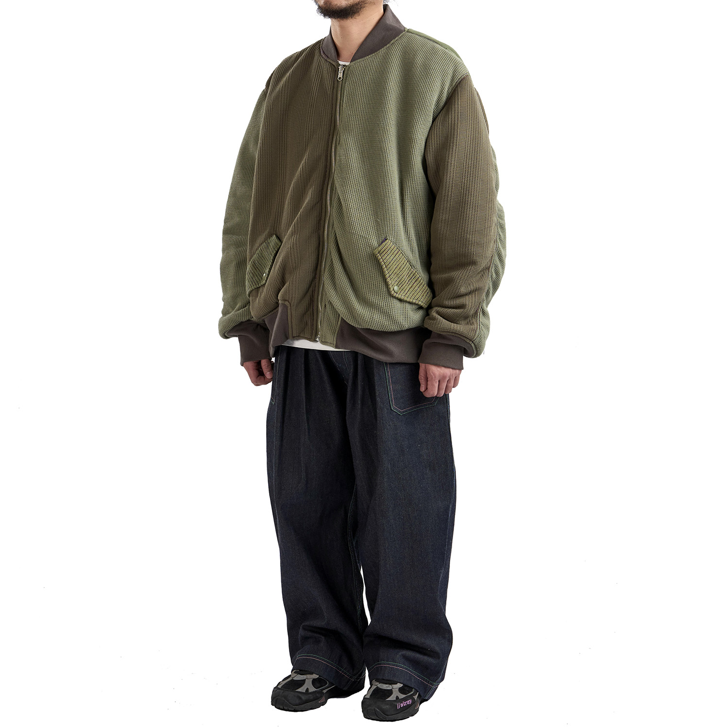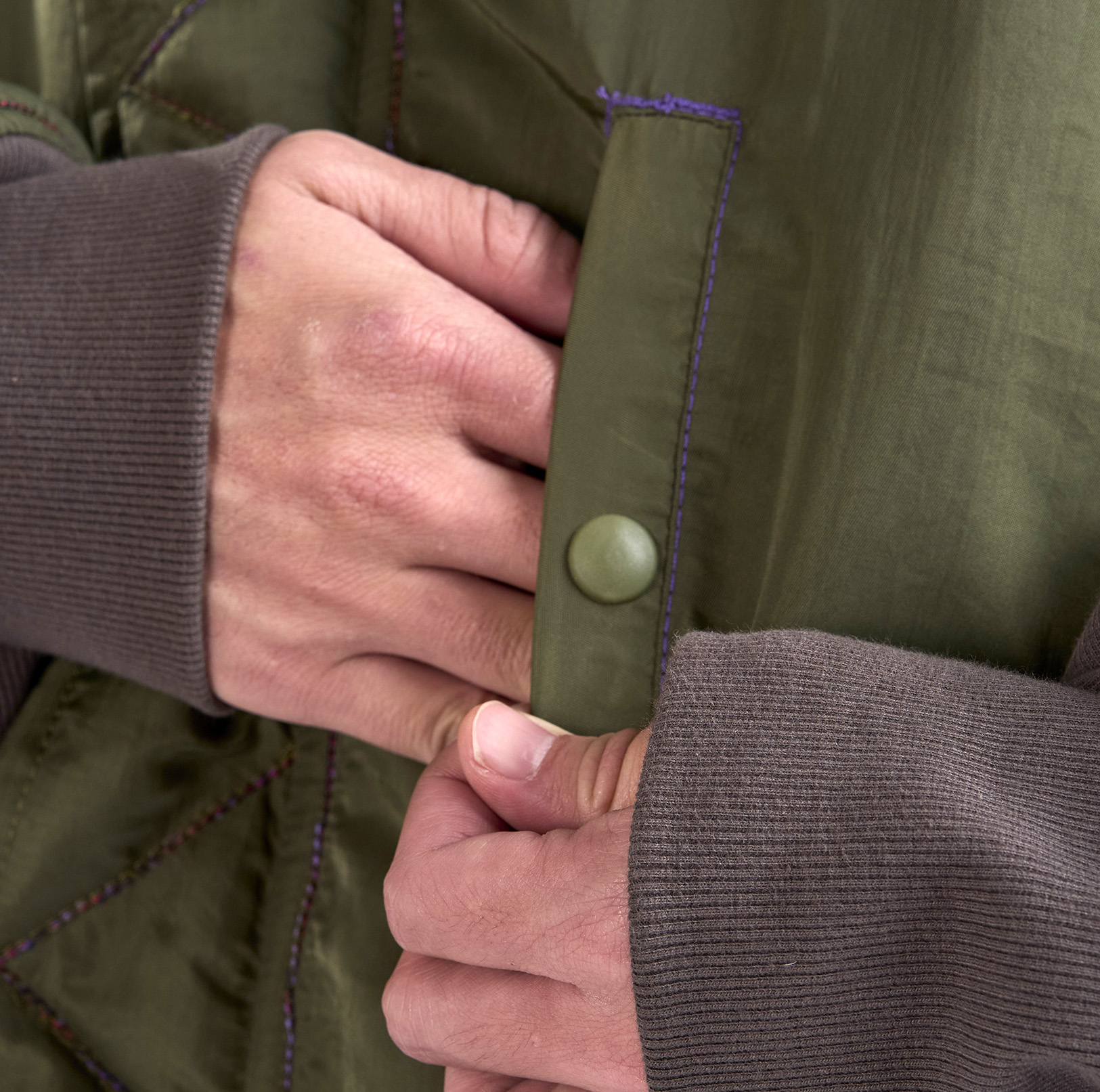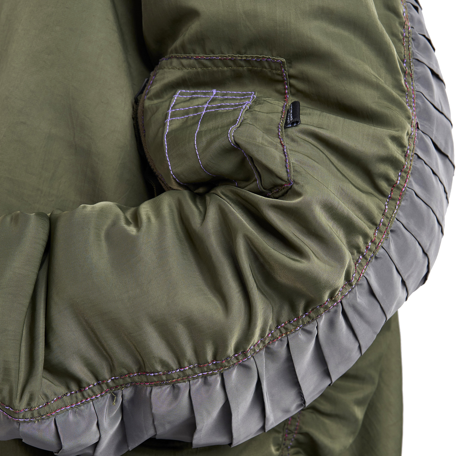 This piece features a reversible YKK zip closure with multicolor rope stitching and a “Peace” motif back paneling. The face side includes a notch detail at hem ribbing on face side, snap flap closure pockets on face side, extended ribbed cuffs, and blanket stitch detail. On the reverse, it is finished with vintage Scovill or General zips at sleeve pocket on reverse, snap closure vertical welt pockets on reverse, and knife pleated sleeves on reverse.