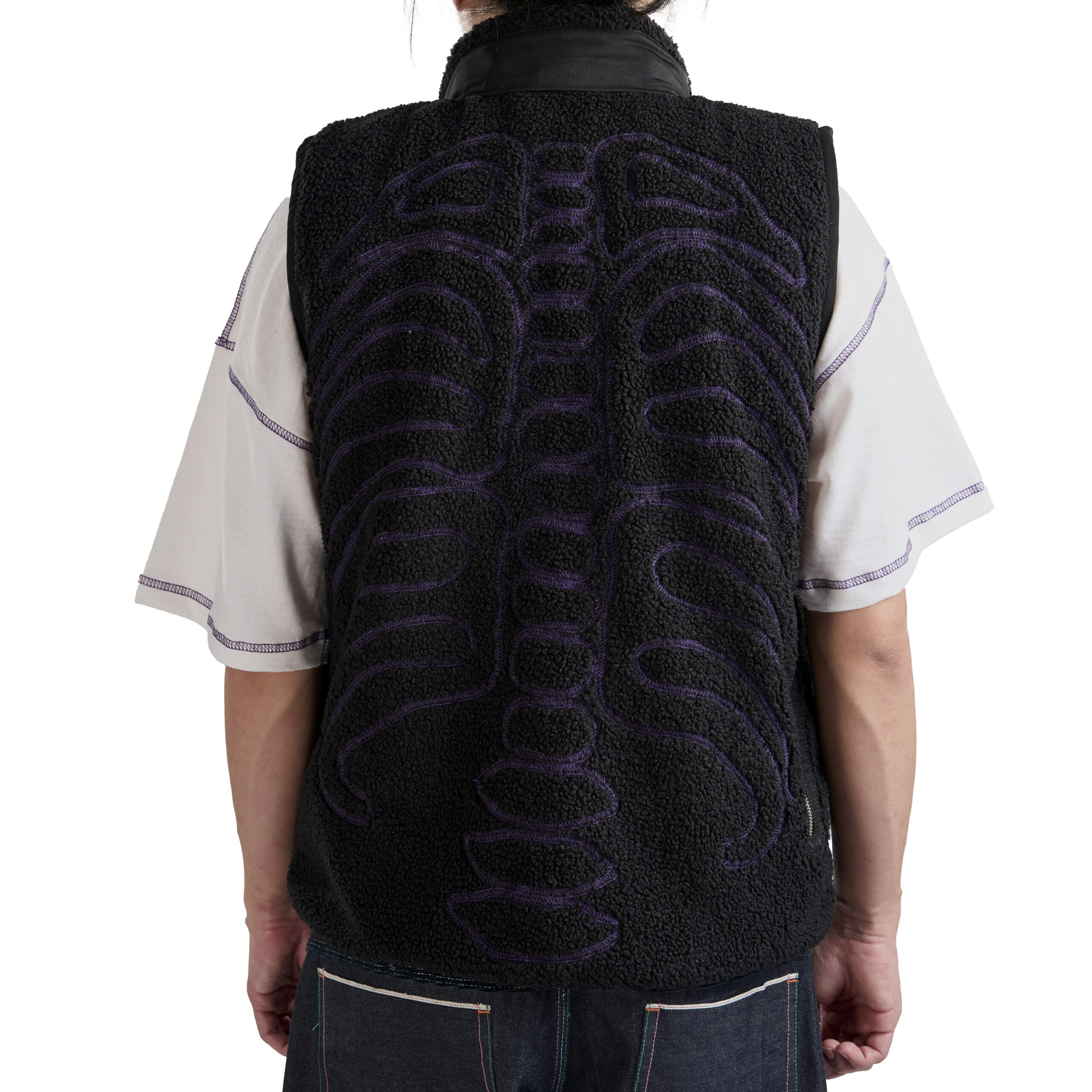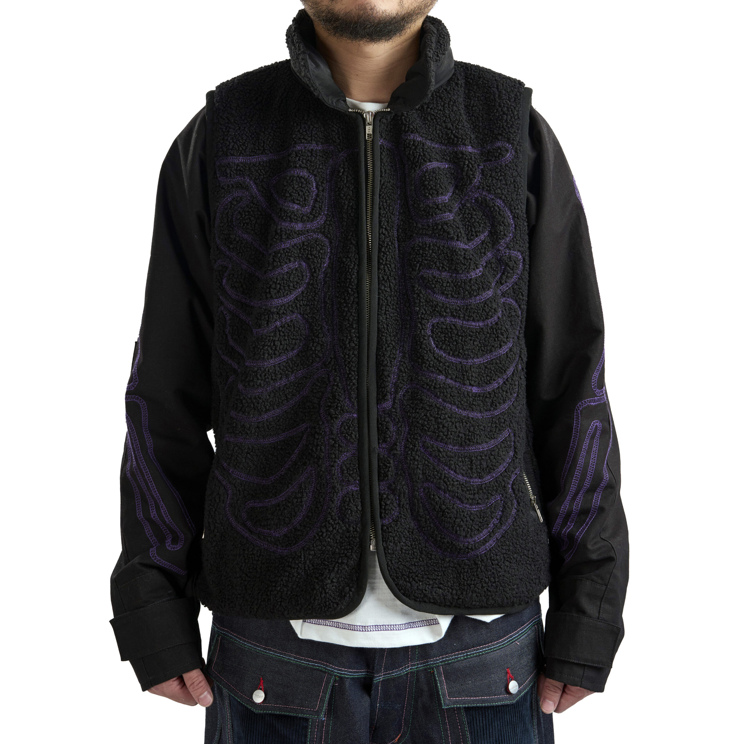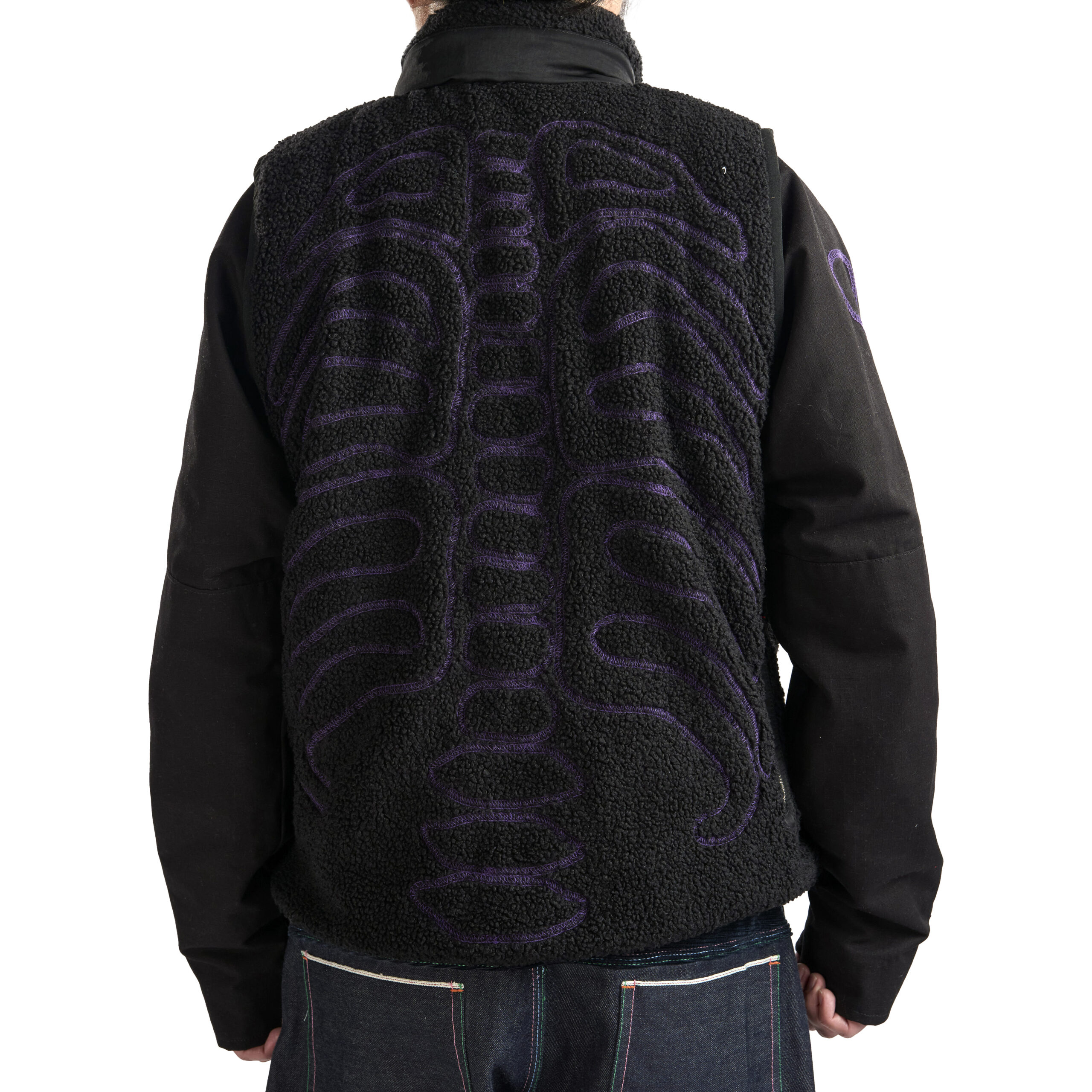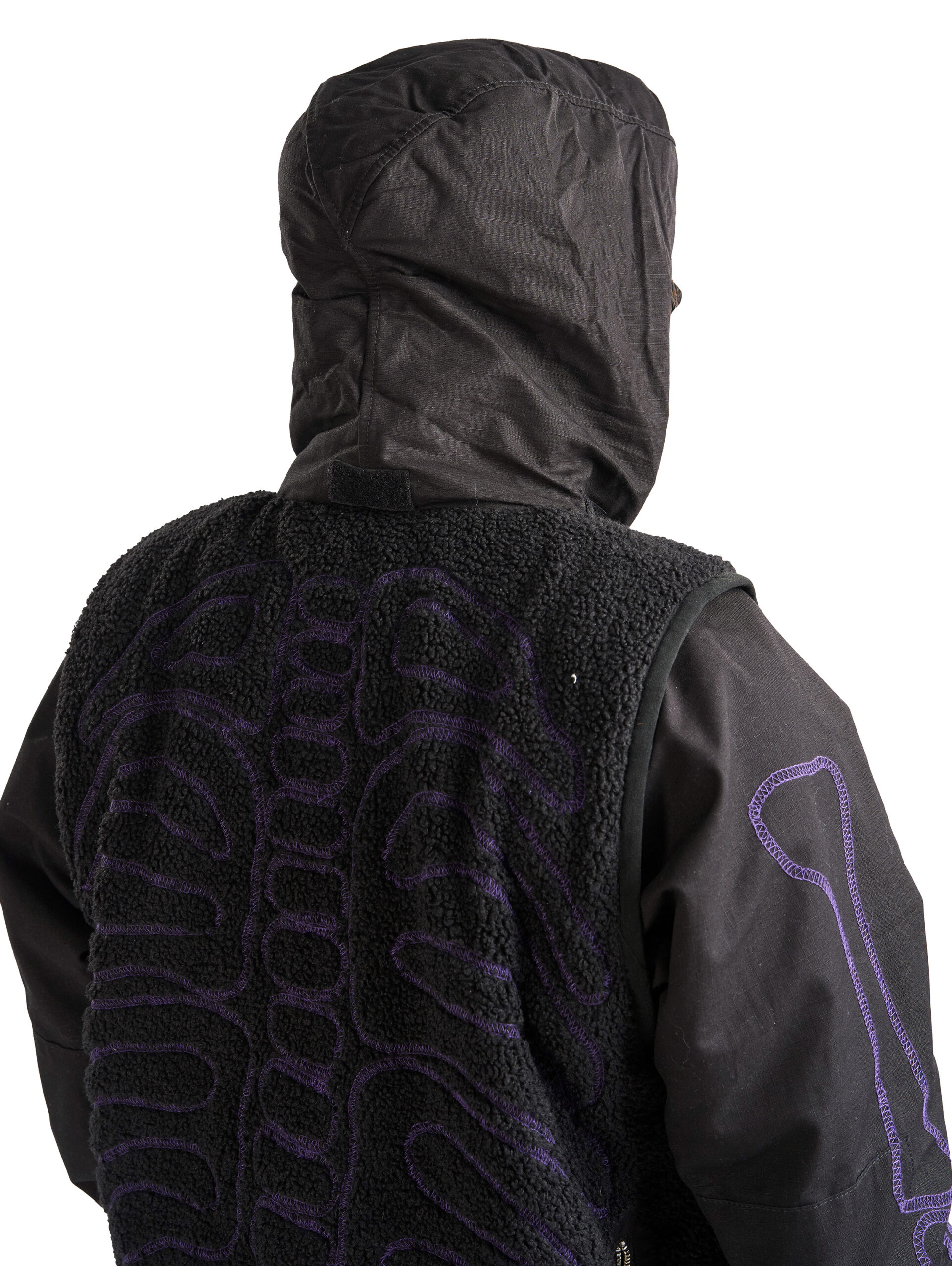 This piece features a purple overlock stitch skeleton motif with a stowable hood and detachable sleeves for adaptable styling. It includes a zip closure, zip pockets at hips, and one zip pocket on back right for storage. A bungee adjust hem and curved front refine the silhouette, while tab adjustable cuffs complete the functional detailing.