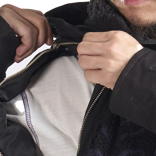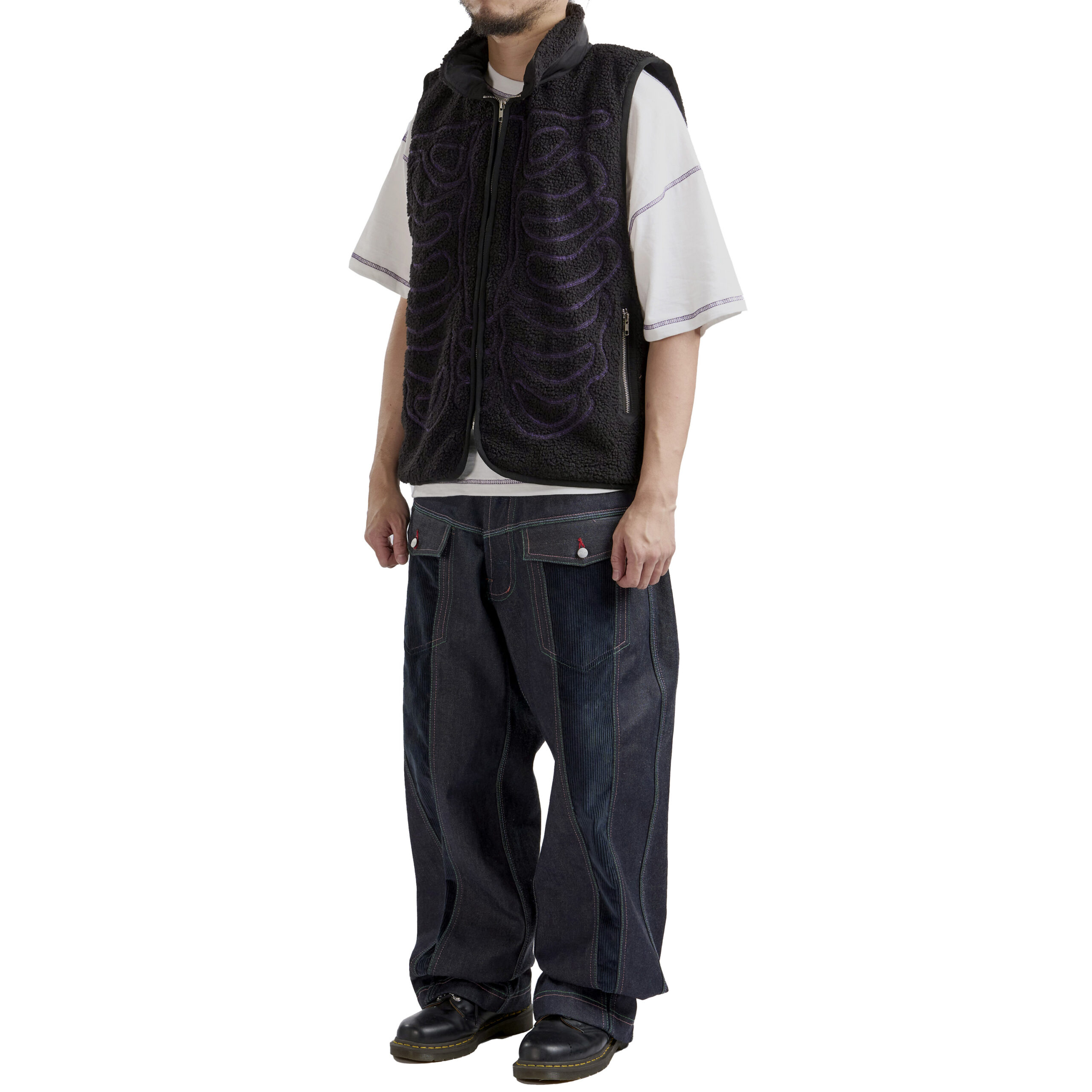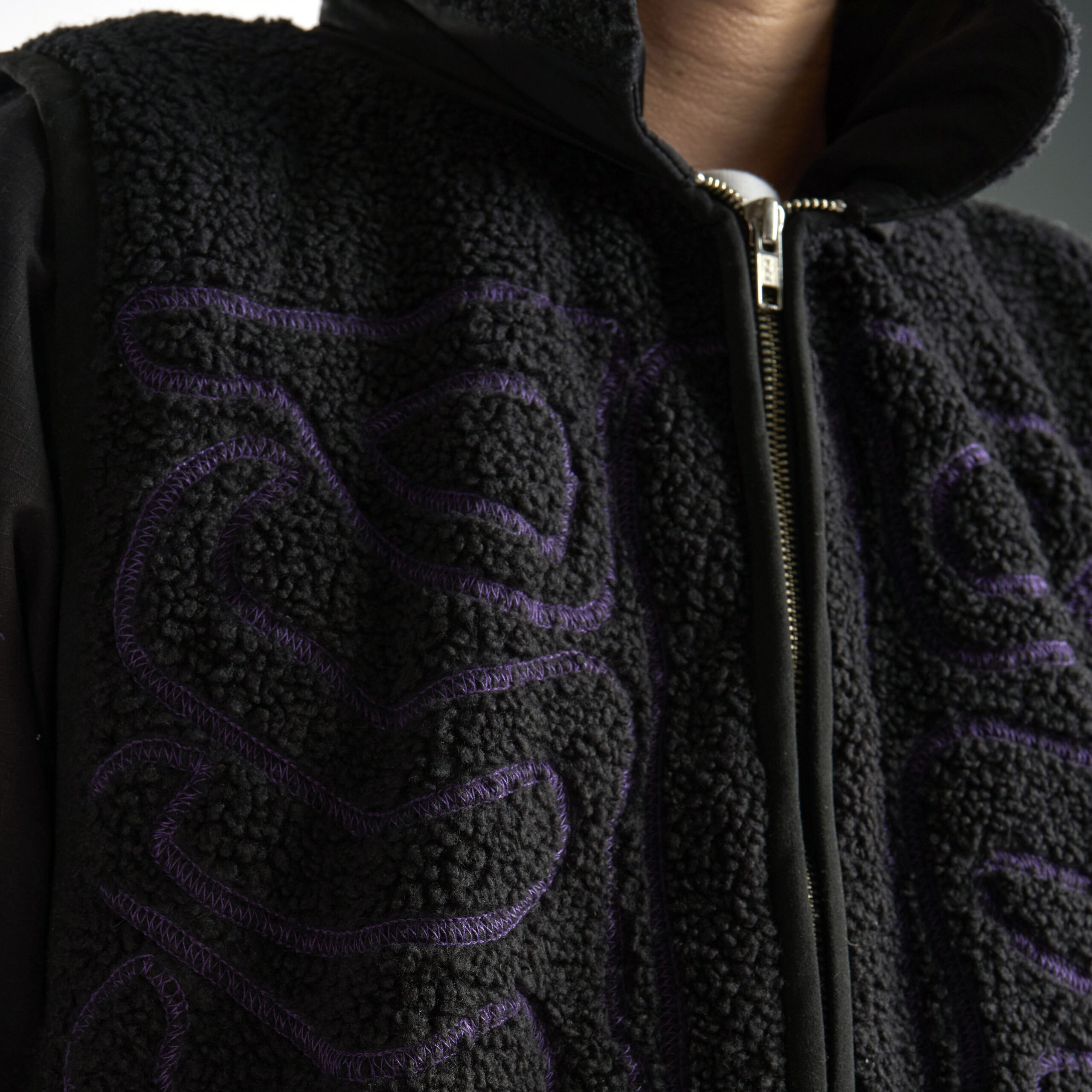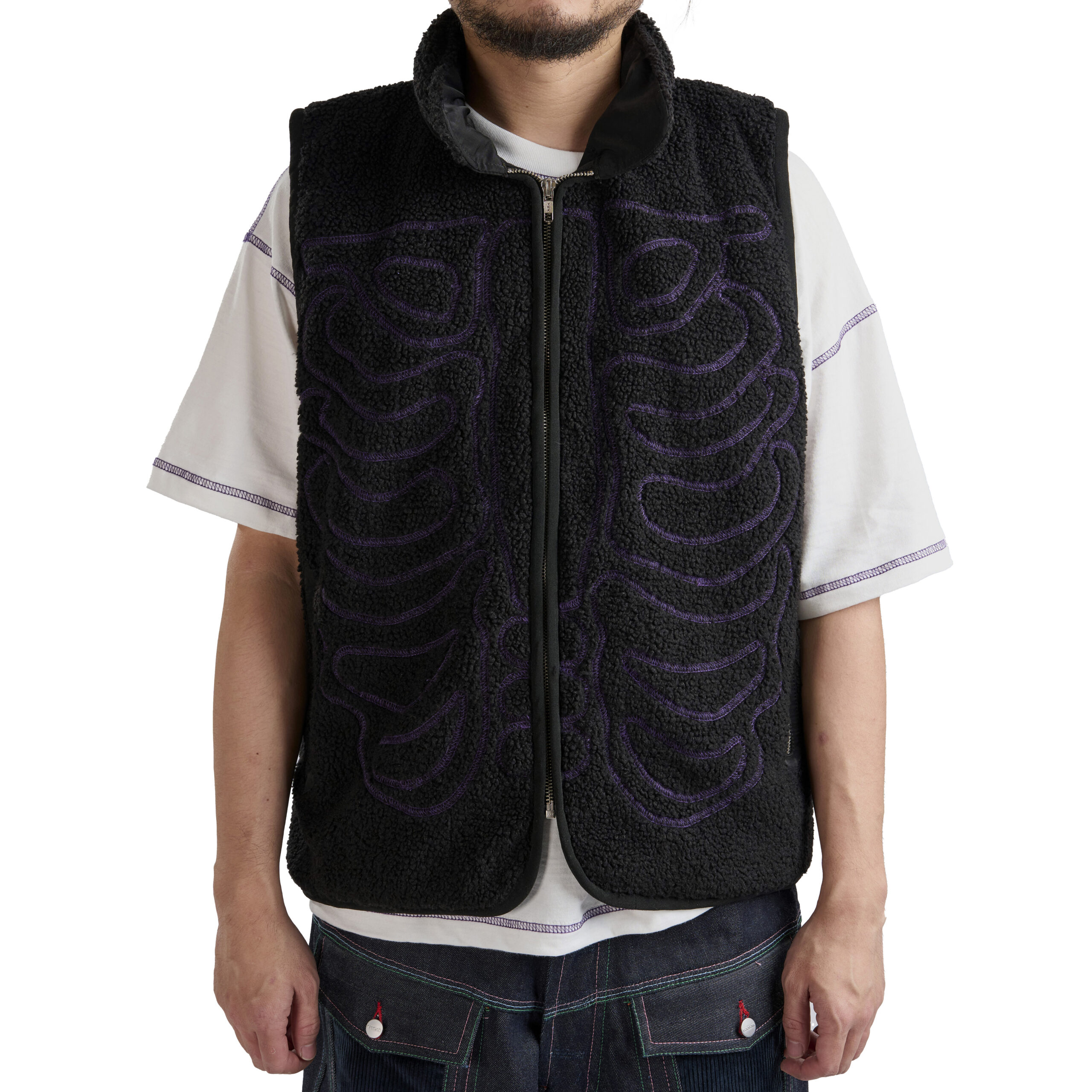 This piece features a purple overlock stitch skeleton motif with a stowable hood and detachable sleeves for adaptable styling. It includes a zip closure, zip pockets at hips, and one zip pocket on back right for storage. A bungee adjust hem and curved front refine the silhouette, while tab adjustable cuffs complete the functional detailing.