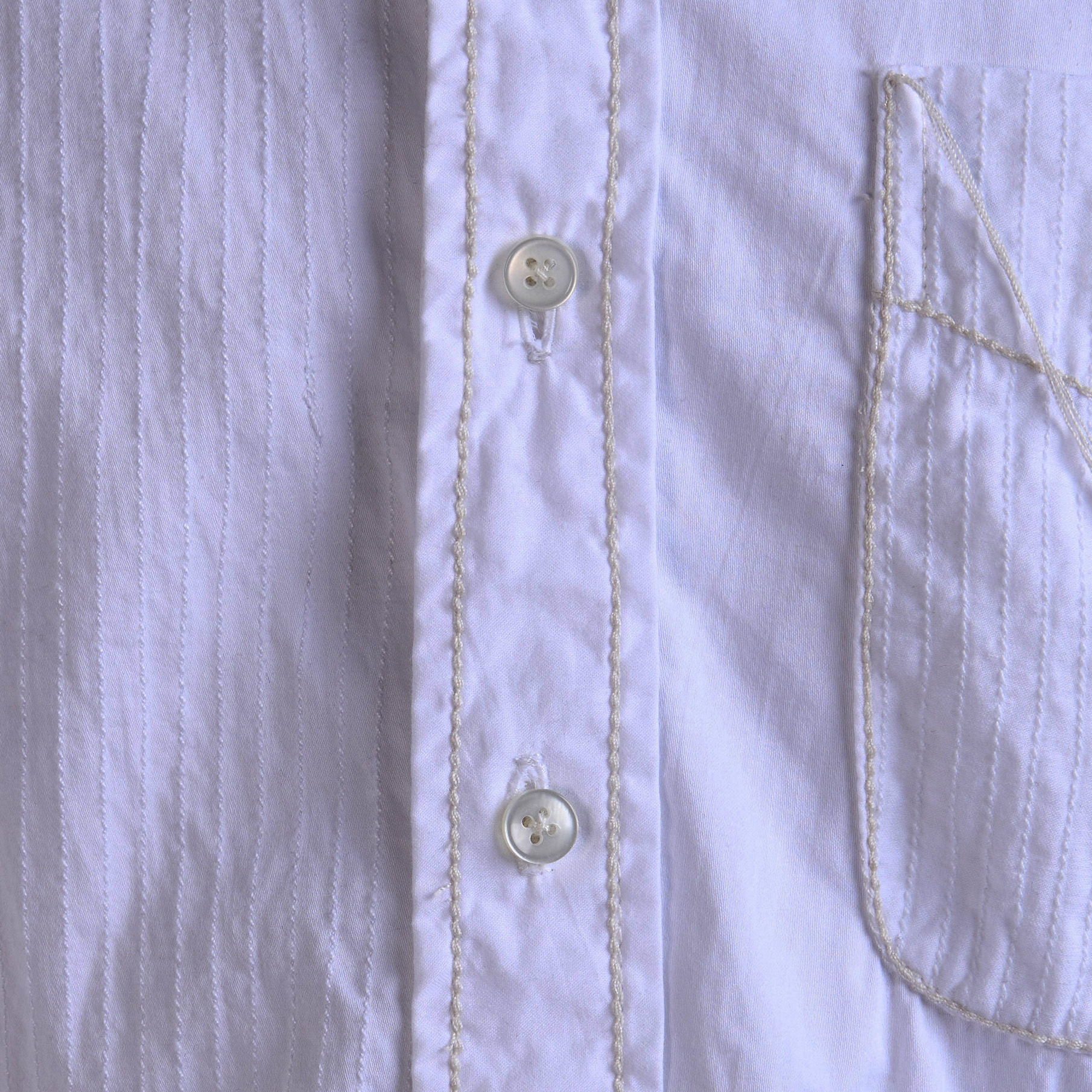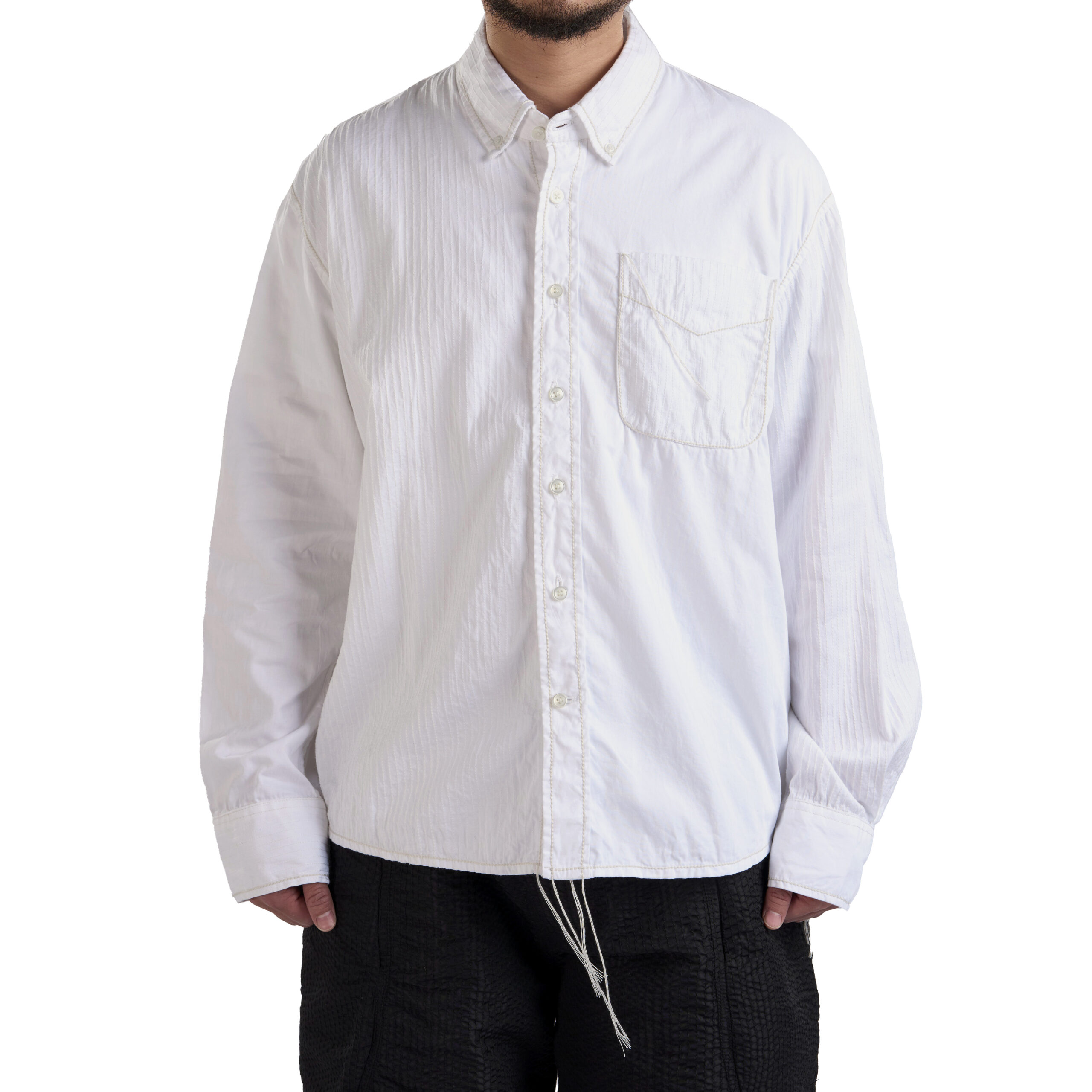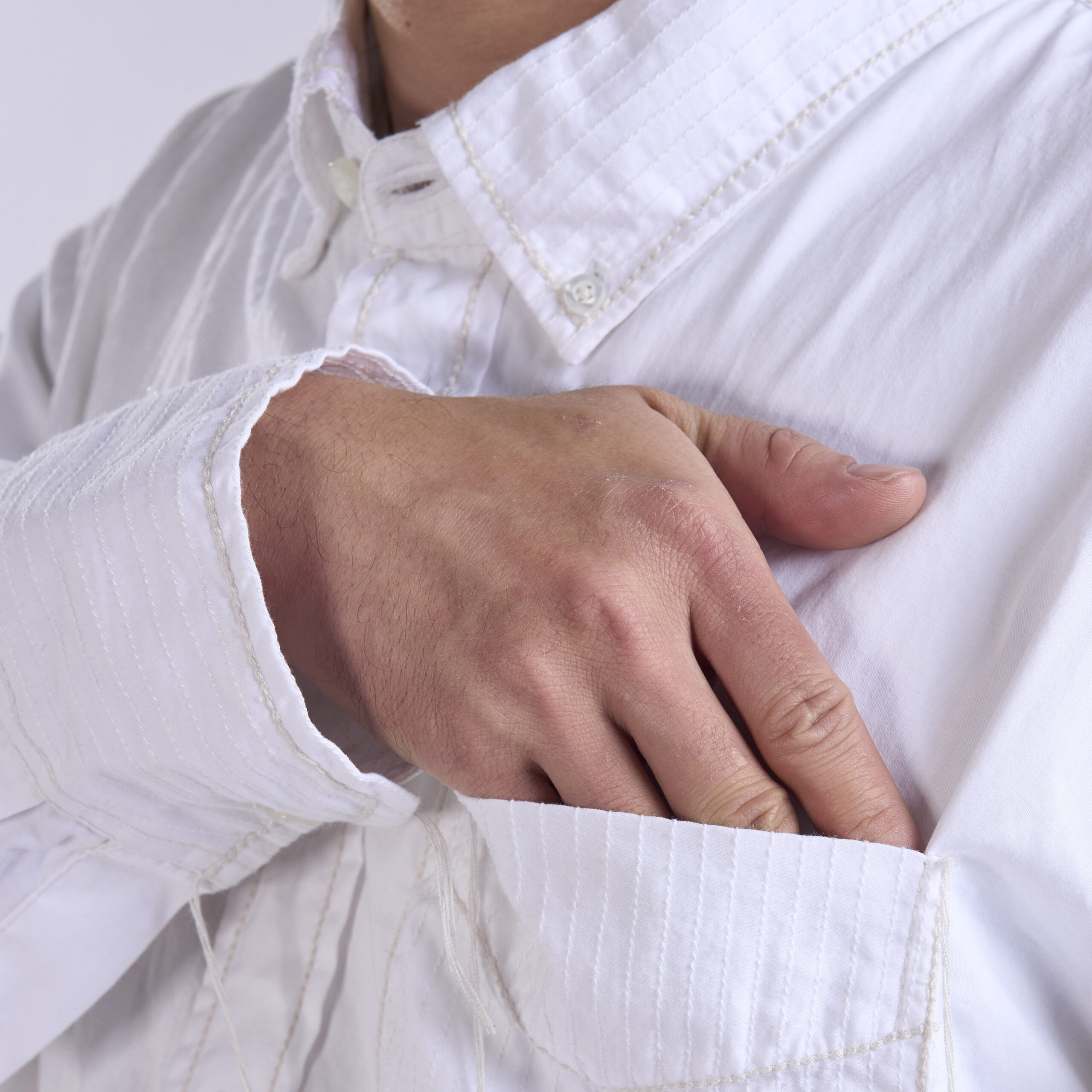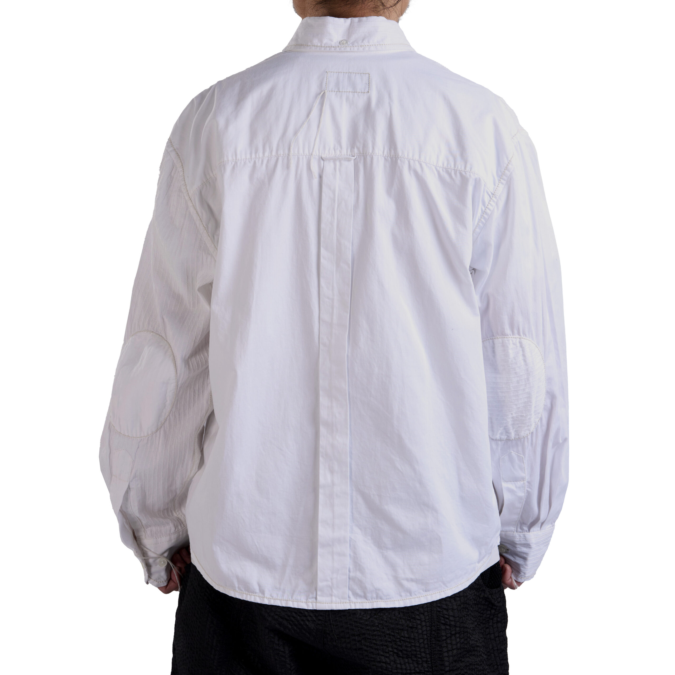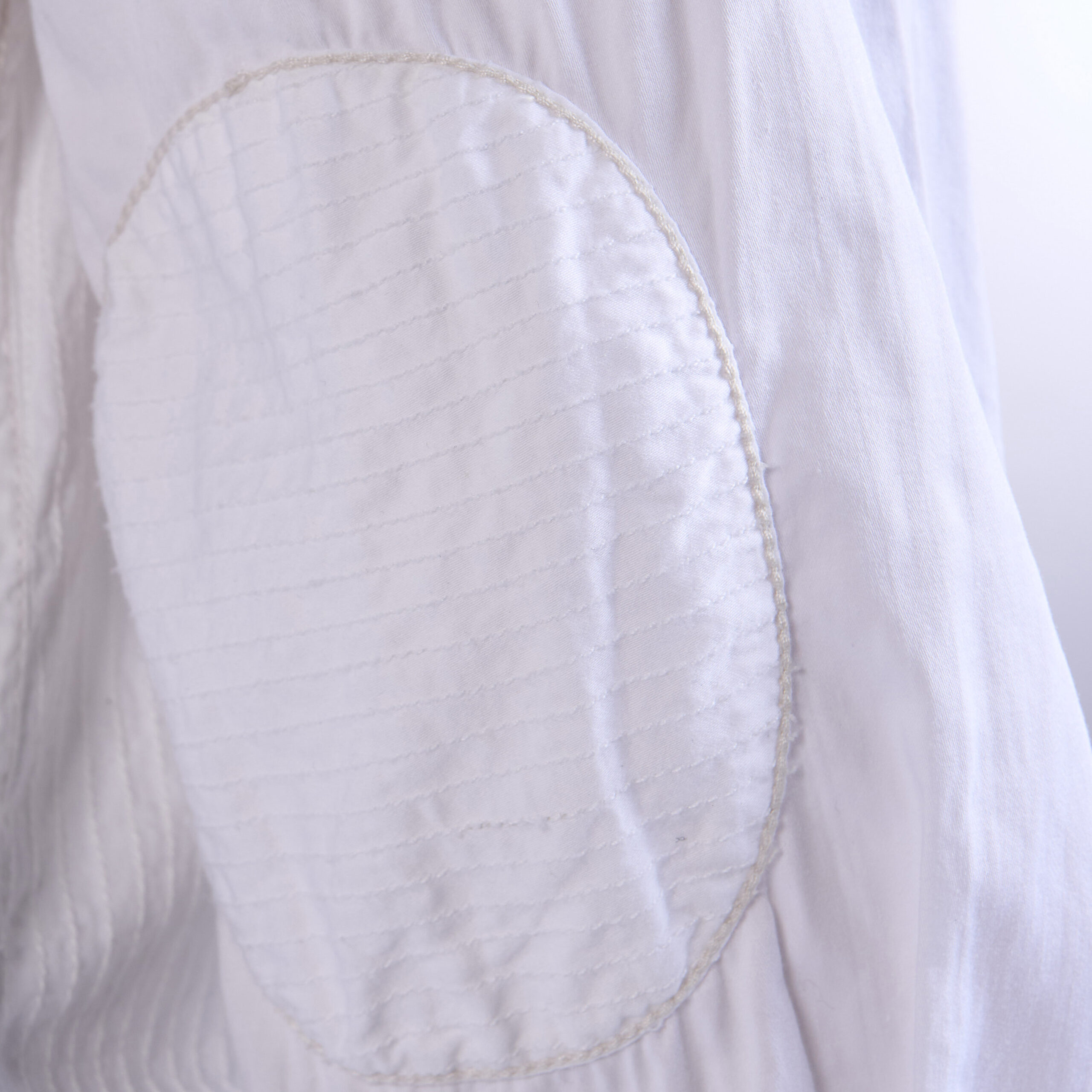 Tonal construction with a button-down collar and contrast rope stitch detailing that adds subtle texture. A chest pocket and elbow patches introduce practical utility, while button cuffs complete the refined finish.