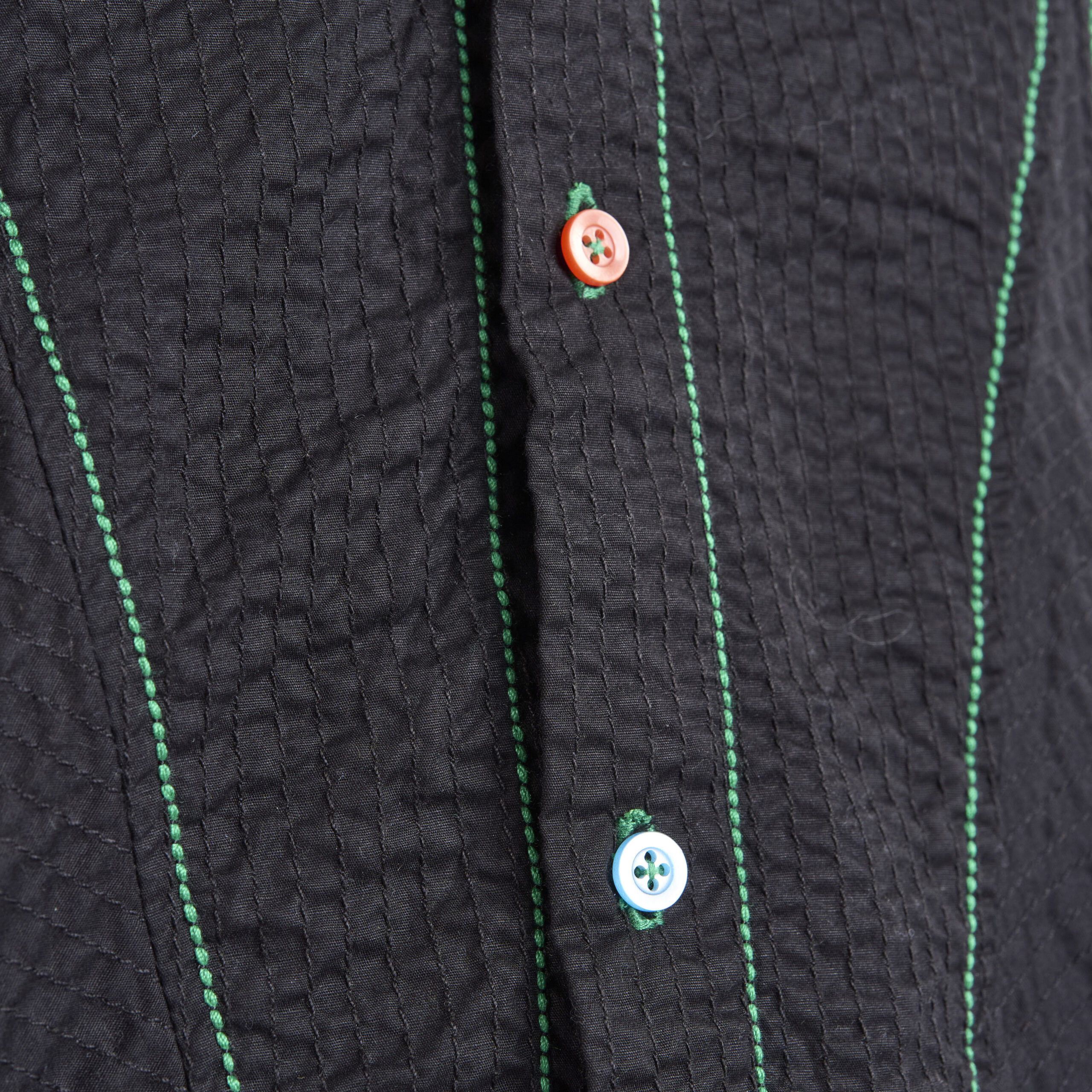 Designed with a standard collar and bias-cut paneling, featuring curved front panels with curved welted pockets for subtle structure. Contrast rope stitch detailing accentuates the construction, while multicolor buttons at placket provide a distinct finishing touch.