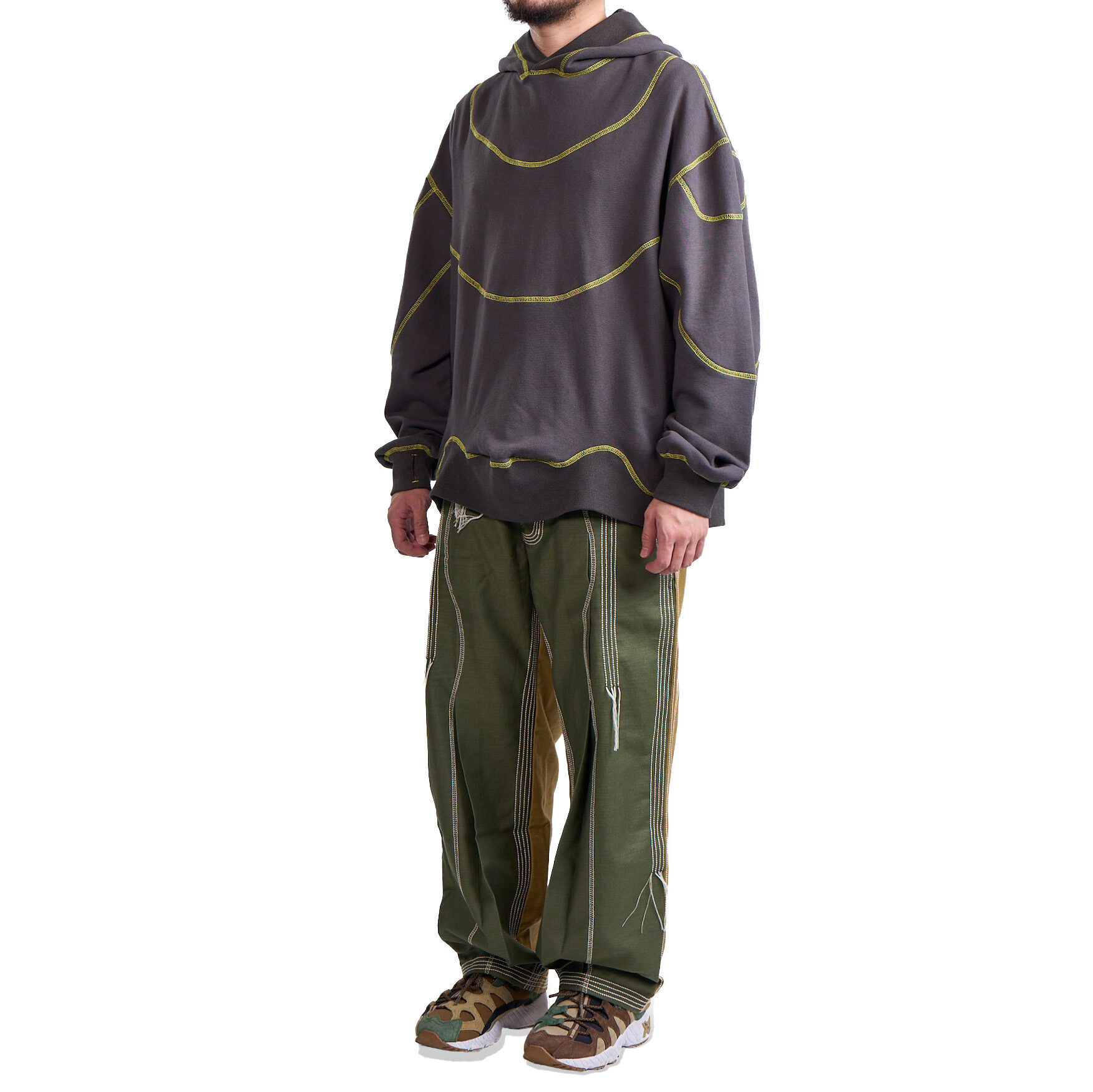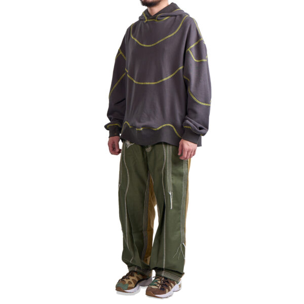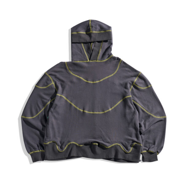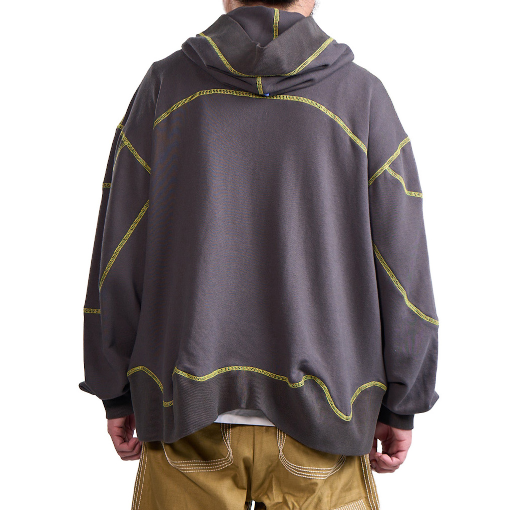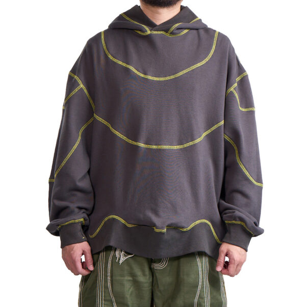 Grey pullover in pure cotton terry. Panels are cut in our Theta Wave pattern and sewn with french seams. Contrast-color overlock stitching reinforces the pattern cutting and highlights construction. Overlapped notch at neckline, finished with wide ribbing at hood, cuffs, and hem. Bartacked thumbholes at cuff for layering options and colder-weather wear. Reinforced side seam pockets close with contrast puller YKK CONCEAL® zips.