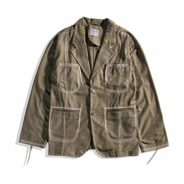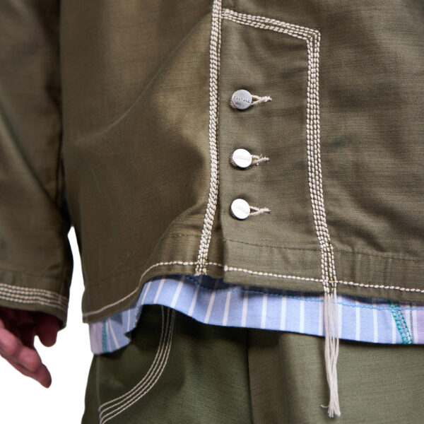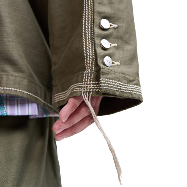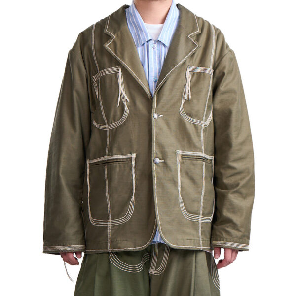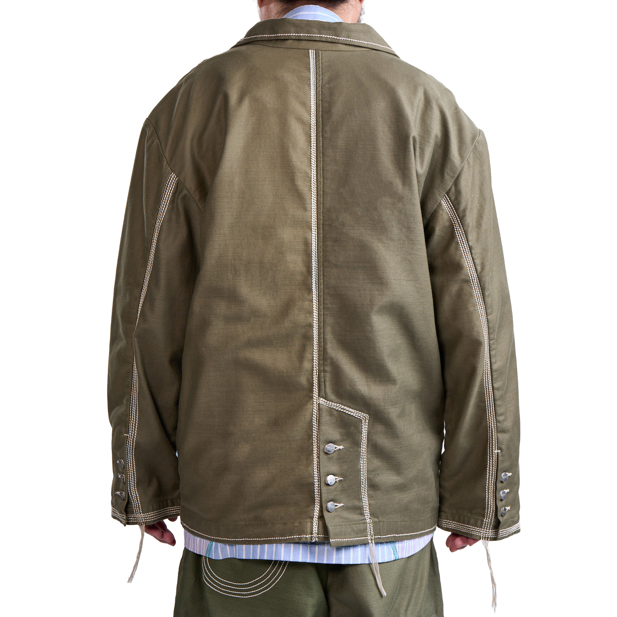 Wide lapel, two-button unlined blazer in Olive cotton back satin. Signature Rope Stitch detailing across pockets and other key points in Theta Wave pattern, with runoff left intact and stitched down into fringing for additional visual interest. All internal seams are piped, with visible overlocking on the face. Four welt pockets provide storage options. Three functioning buttons at cuffs and back vent. Custom YKK metal shank hardware. Finished with contrast stitching.